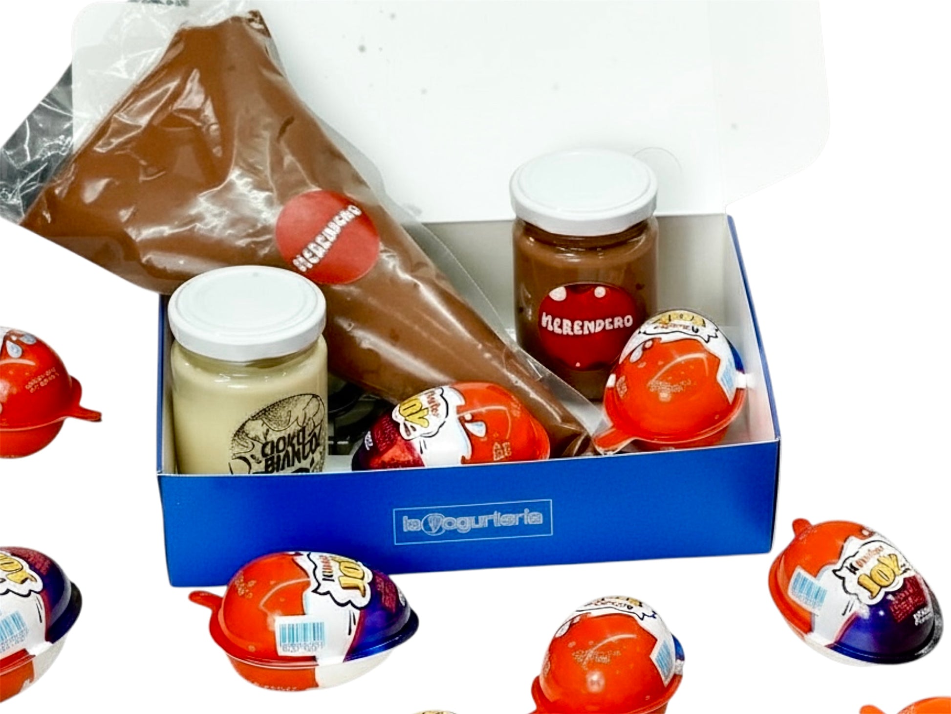 La box golosa comprende 1 sac a poche da 350gr di crema Kinder + 1 vasetti di crema Kinder da 150gr + 1 un vasetto di cioccolato bianco da 150gr + 2 snack Kinder Joy