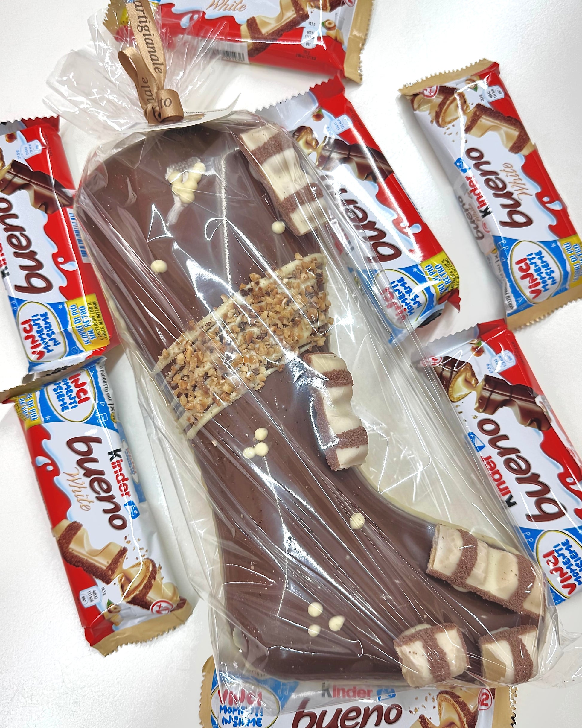Calza di Cioccolato Stampo Artigianale da 800gr di peso circa, metà cioccolato al latte e metà cioccolato bianco, con decorazioni di cioccolato bianco, Kinder Bueno White e granella di nocciola tostata, farcita all’interno con crema alla nocciola e ancora tantissime noccioline.